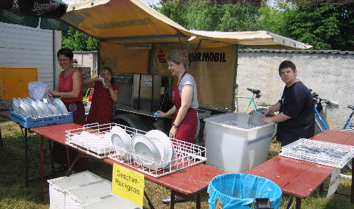 Das Team am Spülmobil in voller Aktion beim Säubern u. Abtrocknen von Tellern, Tassen und Besteck. |