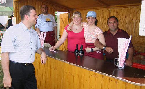 Das Team am Getränkestand verkauft Limo, Cola, Wasser, Apfelsaft sowie Weiß- und Rotwein und Schorlen. |