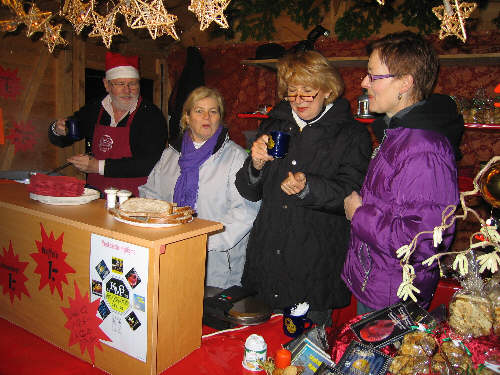 Die erste Arbeitsschicht mit Hans, Ines, Brigitte und Bettina kostet den Apfelglühwein. |