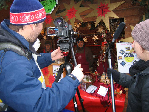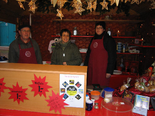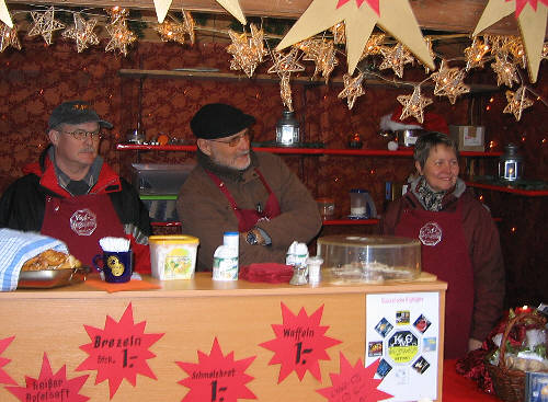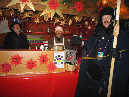 Nachtwächter, Joachim, leuchtet in unserer Marktstand - die Stimmung bei Hans und Dieter hinter der Theke ist bestens. |