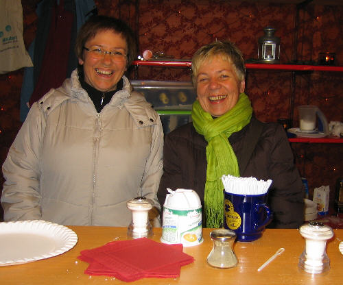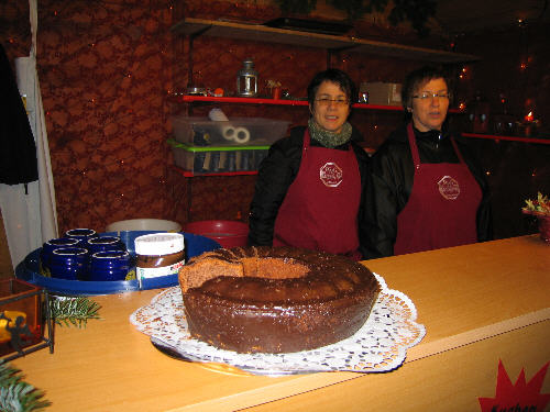 Die letzte Arbeitsschicht mit Claudia und Monika bekommt noch einmal Besuch von den Zuhörern des Konzerts aus der Pfarrkirche (Polizeichor und -orchester). Die Kuchenbäckerinnen waren: Anita Mann, Elisabeth Förster, Tilli Spieß und Marita Volland. |