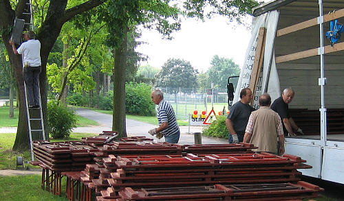 Eine große Zahl Festzeltgarnituren wurde benötigt, da das Kreiskinderchortreffen anstand. Eine gute Beschallung des Festplatz ist dabei sehr wichtig. |