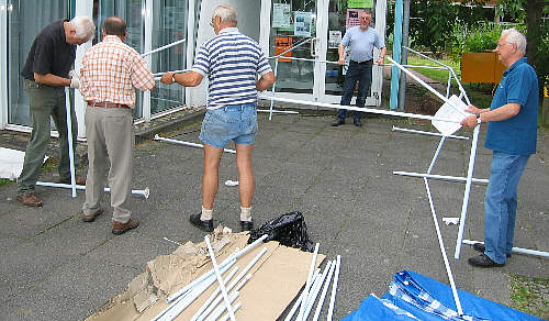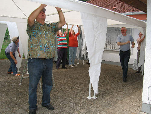 Das Zelt für die Grillküche wird aufgebaut, hier erfolgt der Kampf mit dem Zeltgestänge. |
