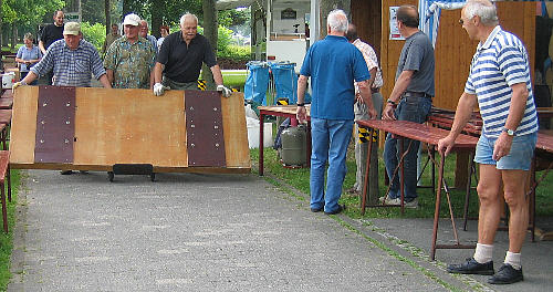 In gemeinsamer Anstrengung wird das Bierrondell platziert. |