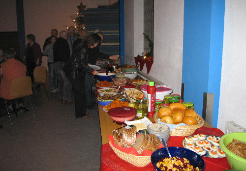 Als erstes wurde das reichhaltige Büfett eröffnet. Die SängerInnen hatten üppige Köstlichkeiten mitgebracht, so war für alle etwas dabei. |