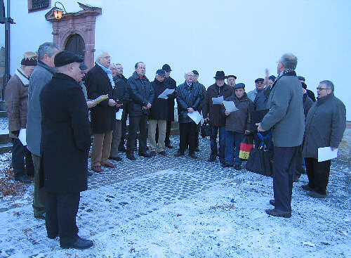 Die Männersänger beim Einsingen mit Helmut Blüm als Dirigent am Außenaltar der Gnadenkapelle. |