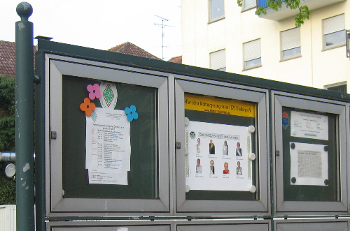 Um den Schaukasten kümmert sich vorwiegend Werner Henrich. Auf der linken Seite vom KMGV-Schaukasten befinden sich Aushänge des FSV und auf der rechten Seite Aushänge des GSL. |