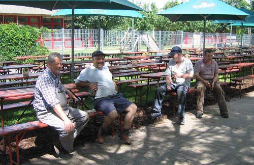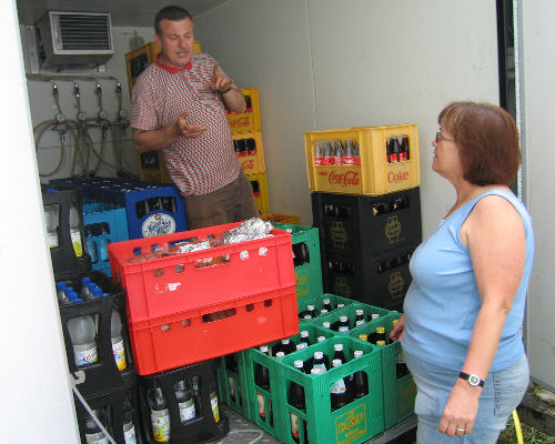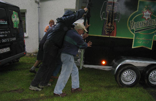 Der Getränkelieferant brachte schon sehr früh den Kühlwagen mit dem Getränkevorrat. Da die Wiese vom vielen Regen noch aufgeweicht war, mußte vereinte Muskelkraft den Wagen schieben. |
