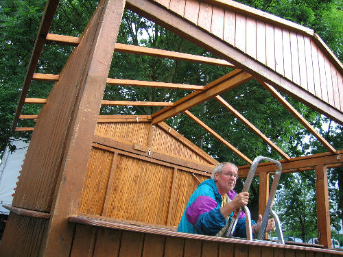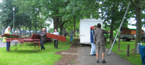 Jetzt kommt auch noch der Bühnenwagen und muß an seinen Platz geschoben werden. Die Bühne muß erst stehen bevor die Festzeltgarnituren plaziert werden können. Neben der Wiese ist, wie im Bild zu erkennen, auf der JuCa-Seite ein ca. 1m breiter Streifen von Matsch. |