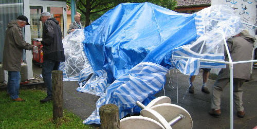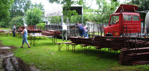 Die Arbeiten sind voll im Gange, Albert transportierte mit seinem LKW die Festzeltgarnituren, während ein Team die Lautsprecher für die Beschallung installiert; derweil ist das Bierkarussell eingetroffen. |