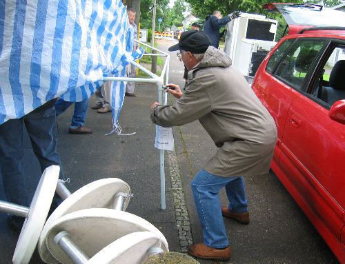 Werner beschriftet die Einzelteile des Zeltgestänges gemäß seinem Aufbauplan; inzwischen transportieren Alexander und Carsten die Kühlschränke vom Heag-Haus. |