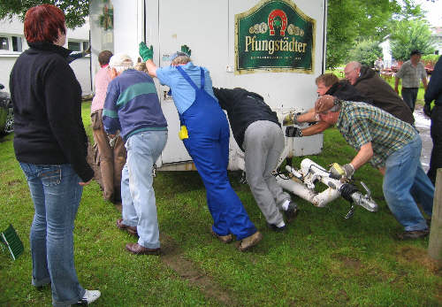 Das Bierkarussell wird mit vereinter Manneskraft in seine Position vor dem JuCa geschoben. |