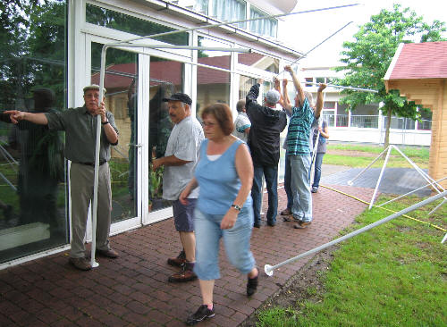 Der Zeltaufbau ist immer ein Abenteuer, hier enträtselt Werner den Aufbauplan während die Plane bereits über das Gestänge des Grillzeltes gezogen wird. |