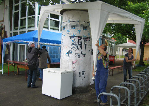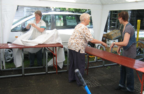 Ein Zelt wandert, es ist das Kassen- bzw. Altarzelt, das neben den Getränkestand kommt. |