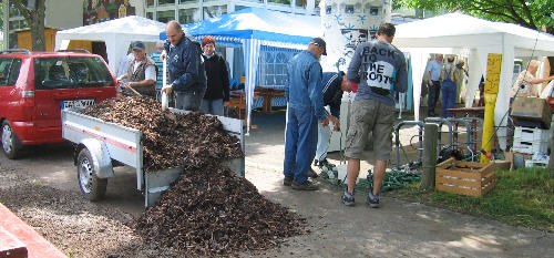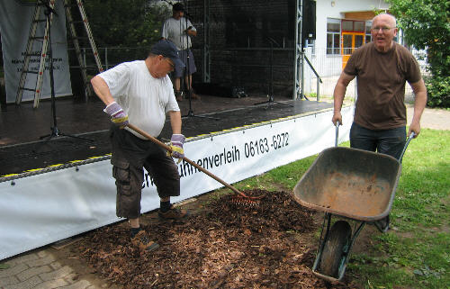 Alexander und Wolfgang verteilen den Rindenmulch über den Matschstreifen, während Dieter schon mal das Mikro testet. |