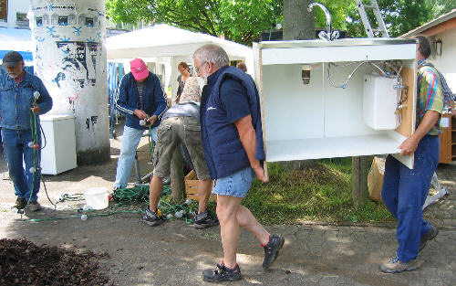 Manfred und Bernhard transportieren die neue Spüle in das Küchenvorbereitungszelt. |