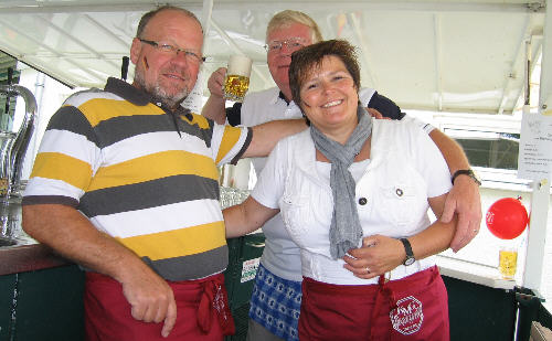 Peter, Dieter und Erika zapfen und verkaufen das Bier. |