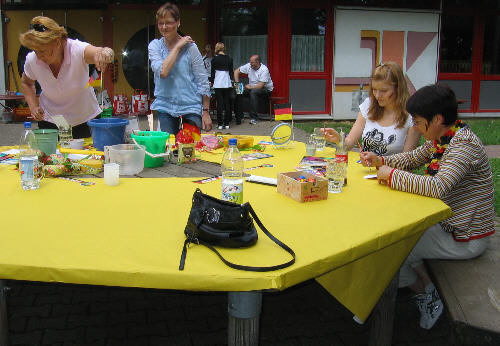Auf dem Spielplatz der Anne-Frank-Schule betreuen Brigitte, Bettina sowie Claudia mit Tochter die kleinen und großen Kinder. Das Basteln und anmalen von Deutschlandfähnchen ist angesagt. |