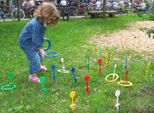 Ein Mädchen ist ganz vertieft in das Ringewerfen. |