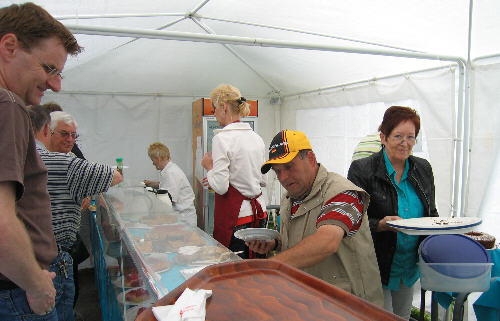 Jetzt läuft der Verkauf von Kuchen im Hochbetrieb mit Christine, Gabi, Marita und Klaus. |