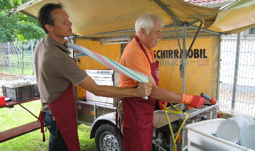 Hier wird Manpower von Helge und Franz mit der Geschirrflut fertig. |