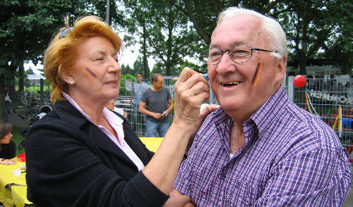 Brigitte versieht die Besucher mit der Kampffarbe für das Public Viewing. |