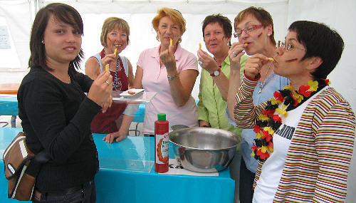 Die letzten Pommes werden verzehrt - ein schönes Waldfest geht zu Ende. Leonie, Helga, Brigitte, Ramona, Bettina und Claudia führen die Stäbchen. |