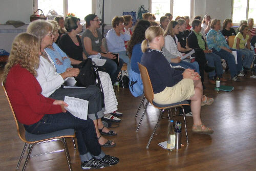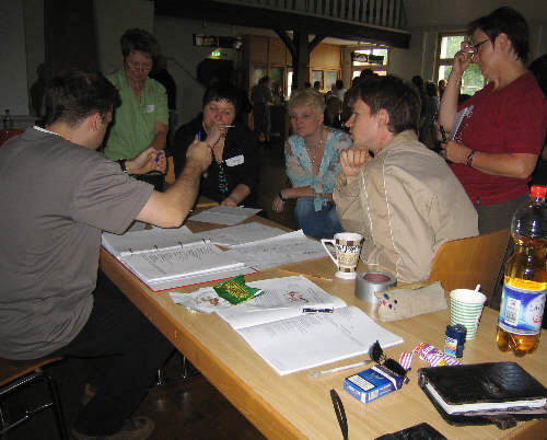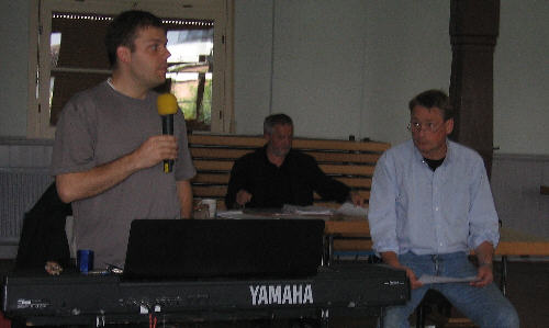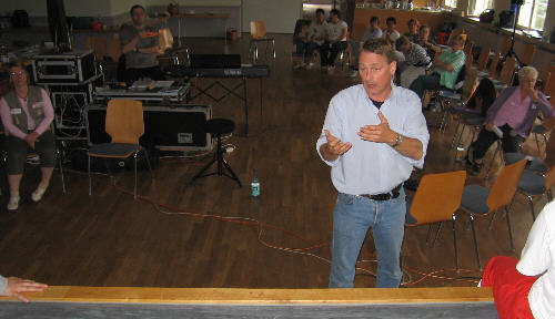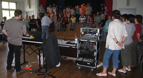 Ralph begrüßt die Sänger/innen und erläutert die Vorgehensweise. Im Hintergrund notiert Arno für das Regietagebuch und Bernd Waldmann ist bereit für die Theaterarbeit. |