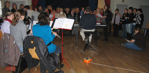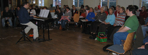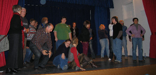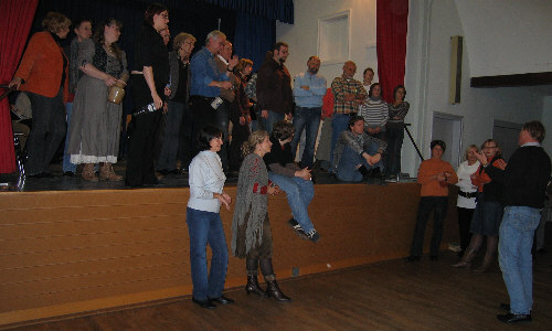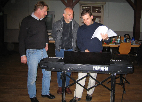 Erstmals stehen die Authoren des Musicals, Bernd und Béla, gemeinsam mit unserem Dirigent Ralph vor den Mitwirkenden. Es wird das volle Programm geprobt, wie am Samstag, jedoch inklusive Schauspiel. |
