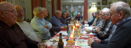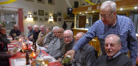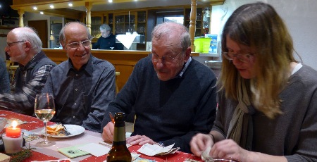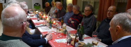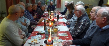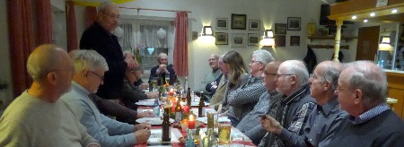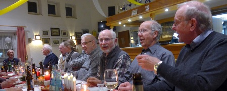 Die Sänger nehmen an der adventlich geschmückten Tafel Platz. Carl-Joseph begrüßt die Sänger, darunter auch Kristina, und erinnert an das erfolgreich durchlebte 150-jährige Jubiläum des KMGV.