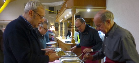 Und schon geht es daran die Teller mit Tafelspitz, Meerrettichsoße, Kartoffeln und Wirsing zu füllen. Albert und Bernhard verteilen die Speisen.