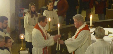 Es folgt eine Zeremonie zu St. Blasius, der Blasiussegen soll u.a. vor Halskrankheiten schützen.